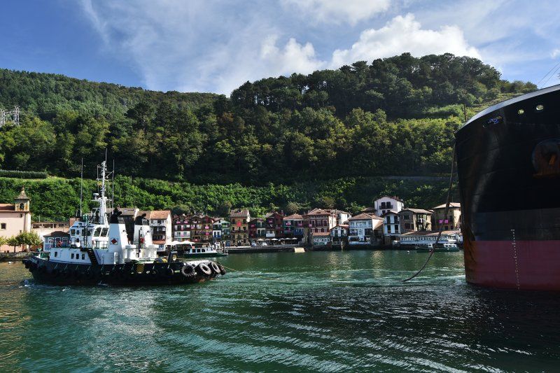 Portuko atoiontzia, merkataritza-ontziari portutik irteten laguntzen, Pasai Donibaneren aurretik pasatuz. / El remolcador del puerto, ayudando al barco mercante a salir del puerto, pasando por delante de Pasai Donibane.