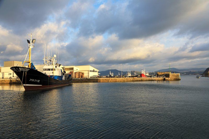 un barco atracado en el puerto de getaria con un atardecer de pelicula