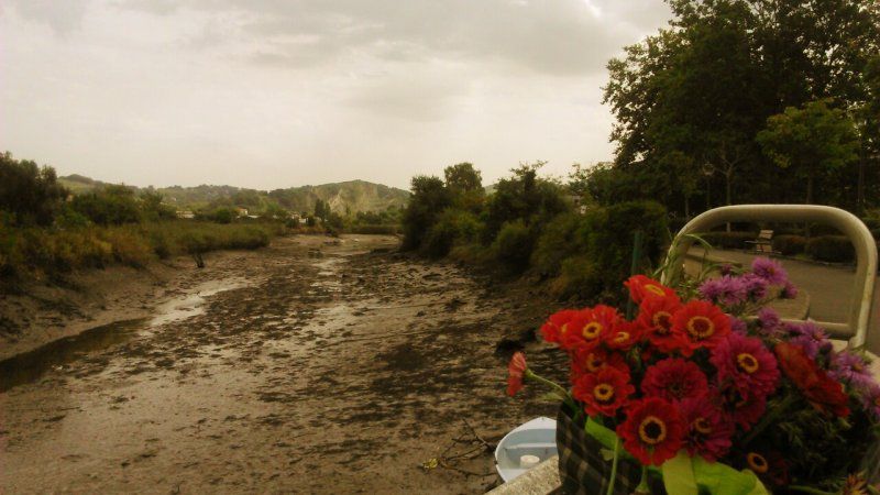 El río Bidasoa, nuestro río, como pocas veces se ve. Sin apenas agua y con el contrapunto casual de ese manojo de flores de alguna huerta cercana.