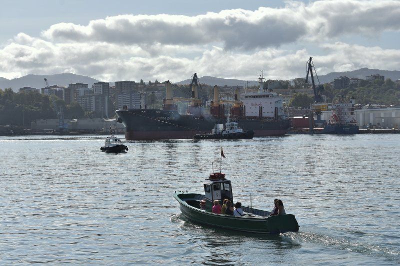 Atoiontziek portutik irteteko biratzen laguntzen diote zamaontziari, motorrean doazenen begiradarekin. / Los remolcadores ayudan al carguero a girar para salir del puerto, con la mirada puesta de los que van en la motora.