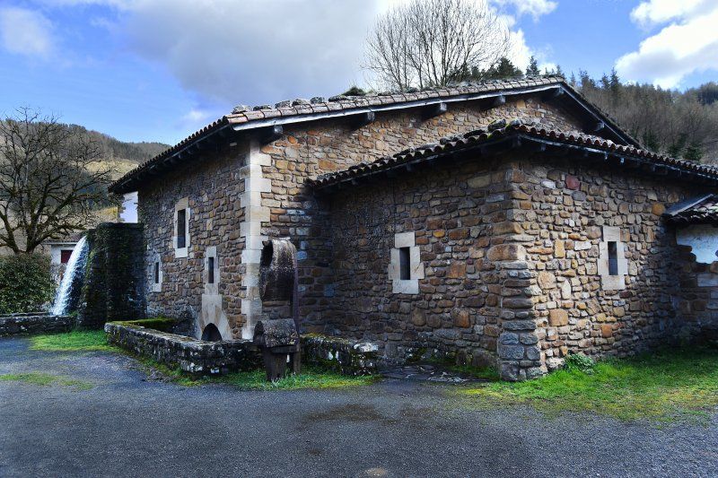 XV. mendeko Mirandaolako burdinola, Legazpin kontserbatzen den bakarra, ur-errota batek eraginda. / La ferrería de Mirandaola del siglo XV, la única que se conserva en Legazpi, instalación accionada, por un molino de agua.