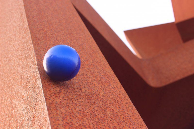 Bola azul deslizándose por la < Construcción vacía> de Oteiza en el Paseo Nuevo donostiarra.