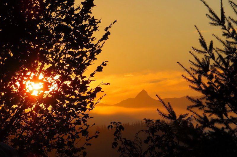 Estampa al amenecer de txindoki ,entre los arboles y cielos luminosos.