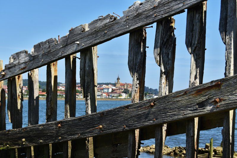 Hondarribiko ikuspegia, Txingudiko badian hondoratutako itsasontzi baten egur hondakinen artetik. / Vista de Hondarribia desde los restos de madera de un barco hundido en la bahía de Txingudi.