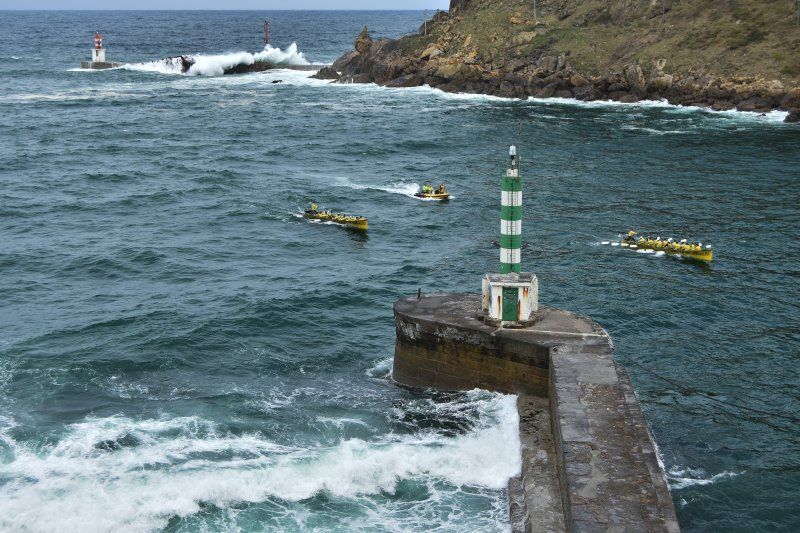 Pasaiako portuko bokalean entrenatzen ari diren traineruak. / Traineras entrenando en la bocana del puerto de Pasaia.