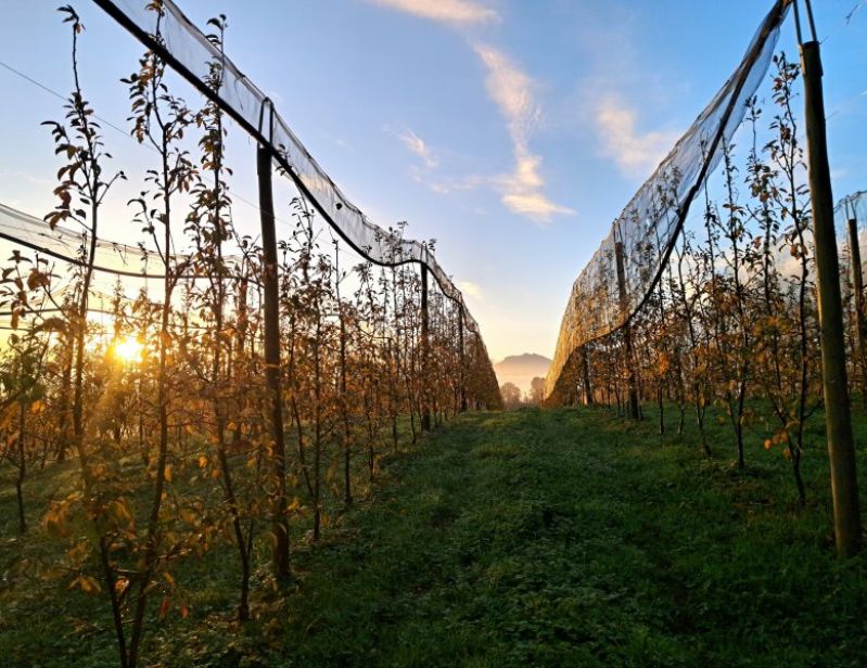 Amanece sobre el manzanar de Unanue Zar una mañana fría de invierno.
