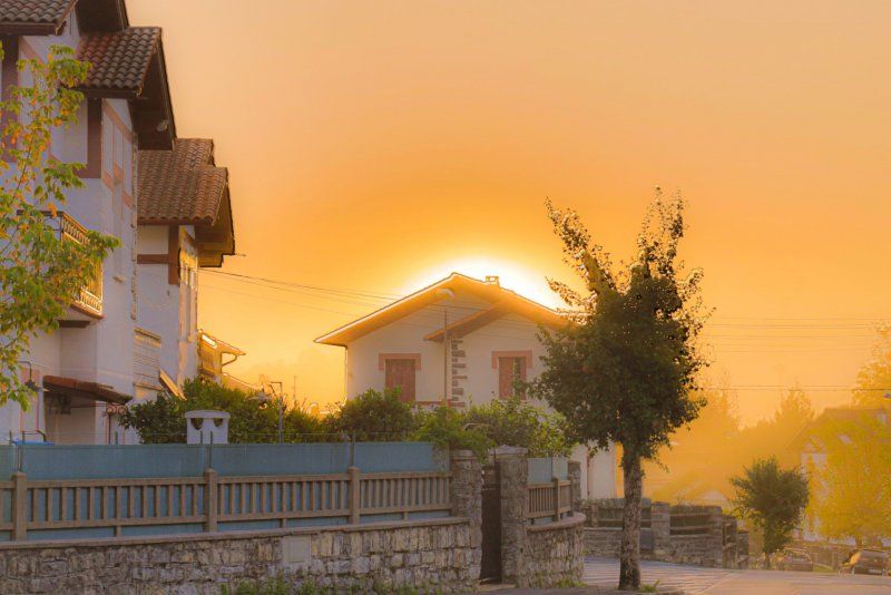 Irun amanecer en el barrio Anaka la casa tapando el sol con una mañana de niebla