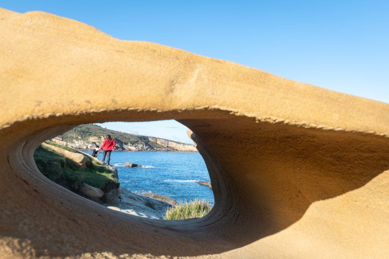 Típica roca arenisca con un aguajero que se ve una preciosa mujer con su perro y la Punta Biosnar de fondo