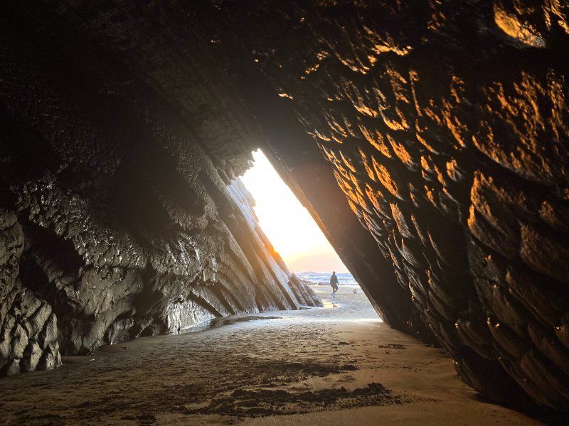 atardecer desde el interior de la cueva de algorri en la playa de itzurun zumaia