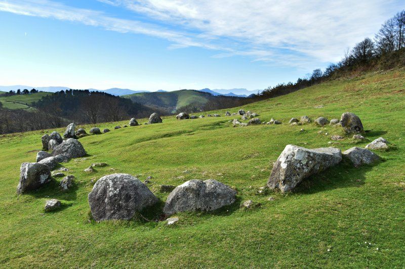 Mairubaratza, zazpi harrespildun multzoa, bertako granitokoak, Oianleku gainan. / Mairubaratza, conjunto de siete cromlech, de granito autóctono, en el alto de Oianleku.