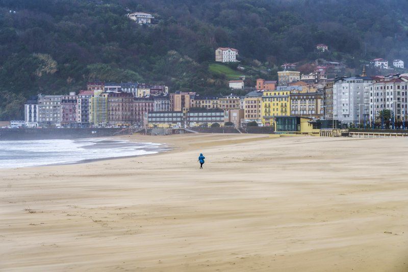 Dia lluvioso en la Zurriola, esta persona sola en toda la playa como si fuera la unica superviviente.