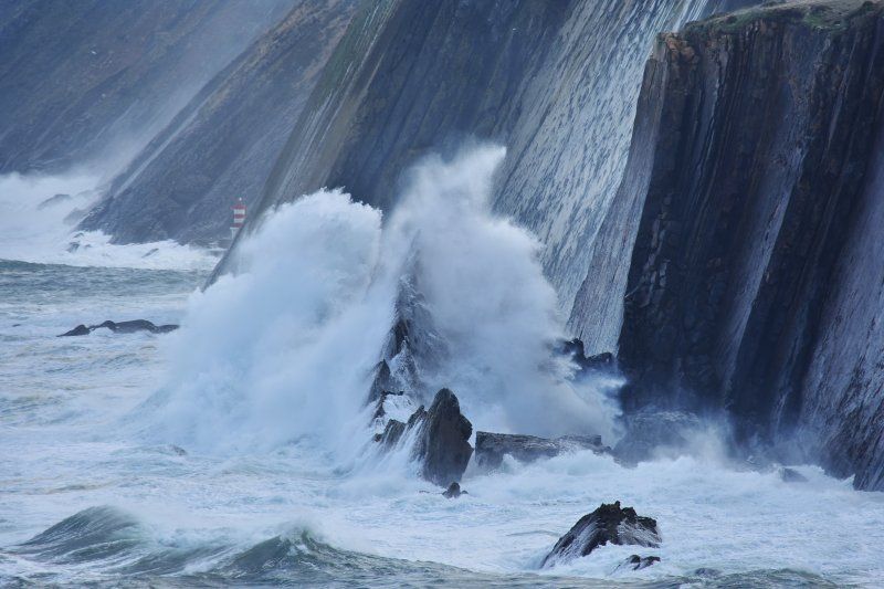 Olatua apurtzen, La Platako itsasargia dagoen labarrean, Pasaiako portuaren sarreran. / Ola rompiendo, en el acantilado donde se situa el Faro de La Plata, a la entrada al puerto de Pasaia.