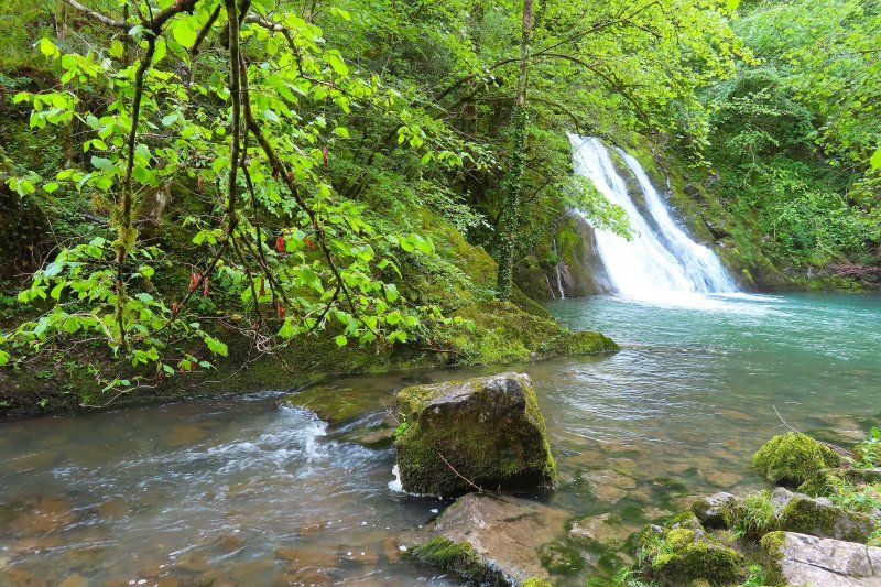 Rincon tropical en el corazon del goierri,con su cascada y poza turquesa,caracteristica.