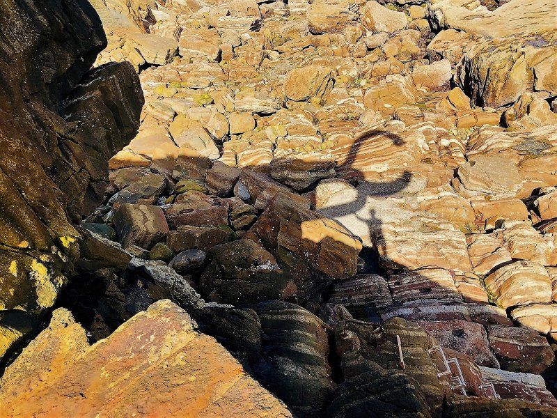 Yo y el Peine del Viento reflejados en las rocas secas de la rasa mareal