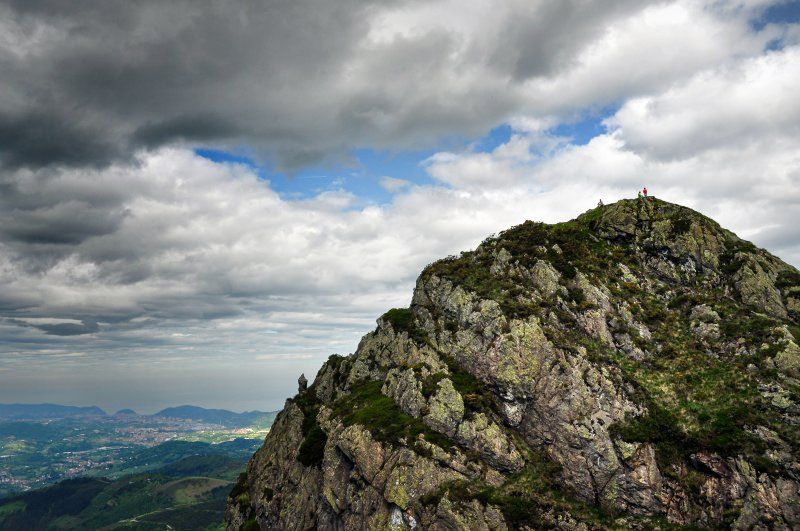 Peñas de Aia con montañeros en la cima y San Sebastian al fondo.