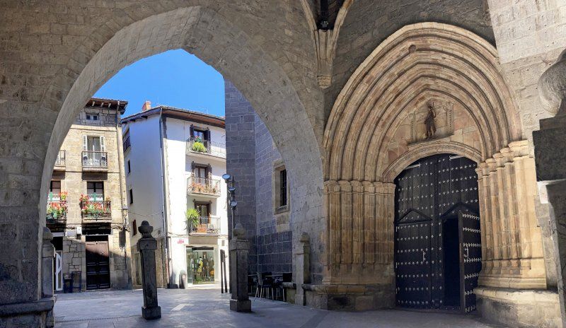 Mendizorrotz mendia bere antenekin, eta mendiaren magalean, baserriak, bideak eta zelai berdeak. / El monte Mendizorrotz con sus antenas, y a las faldas del monte, caseríos, caminos y verdes prados.
