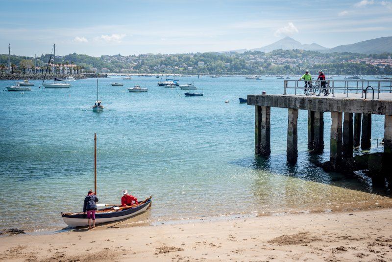 Dos ciclistas observan las maniobras de dos personas que se disponen a navegar en su barca.