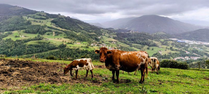 > En la imagen se puede ver una vaca junto a su ternero en primer plano. Al fondo el monte que está sobre Leaburu.