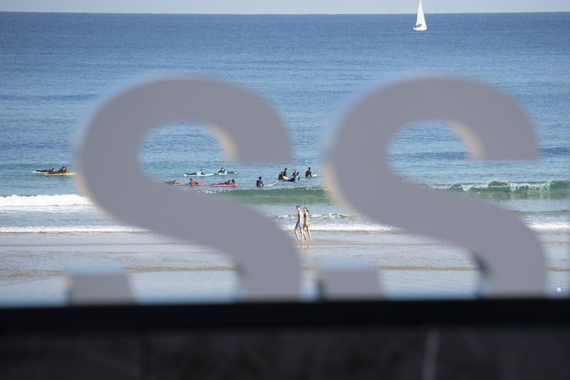 La silueta de unas mujeres que se dirigen a hacer surf en la puesta de sol con el Ratón de Getaria al fondo