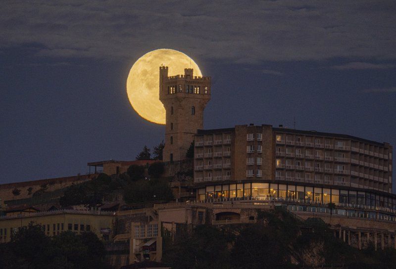 Puesta de super luna de octubre, tras el torreón del Monte Igeldo