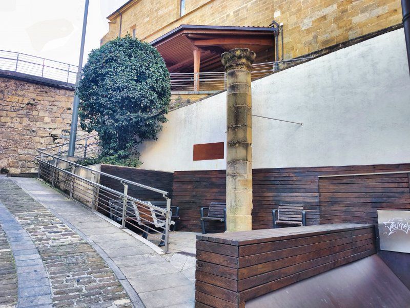 subiendo al pórtico de la iglesia de Orio, una de las pocas columnas recuperadas.